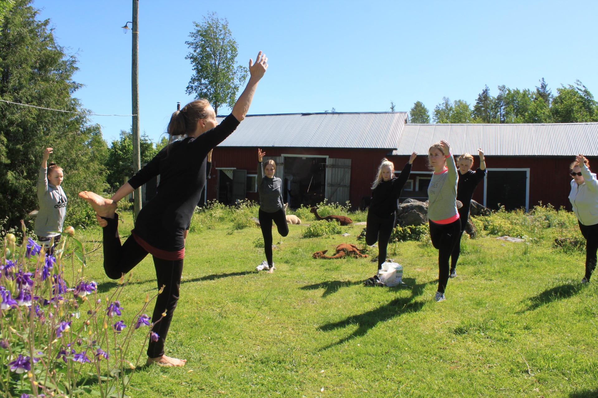 Alkajaisiksi kuulemme lyhyen esittelyn siitä mihin ollaan tultu ja keitä ollaan (n. 15min) ja nautimme samalla terveelliset voimasmoothiet. Joogaosuus kestää n. 45min ja se toteutetaan hyvällä ilmalla alpakoille aidatulla pihamaalla, sateisena/tuulisena päivänä sille varatussa, vanhaan talliin tehdyssä Olotilassa, jossa myös alpakat viihtyvät.